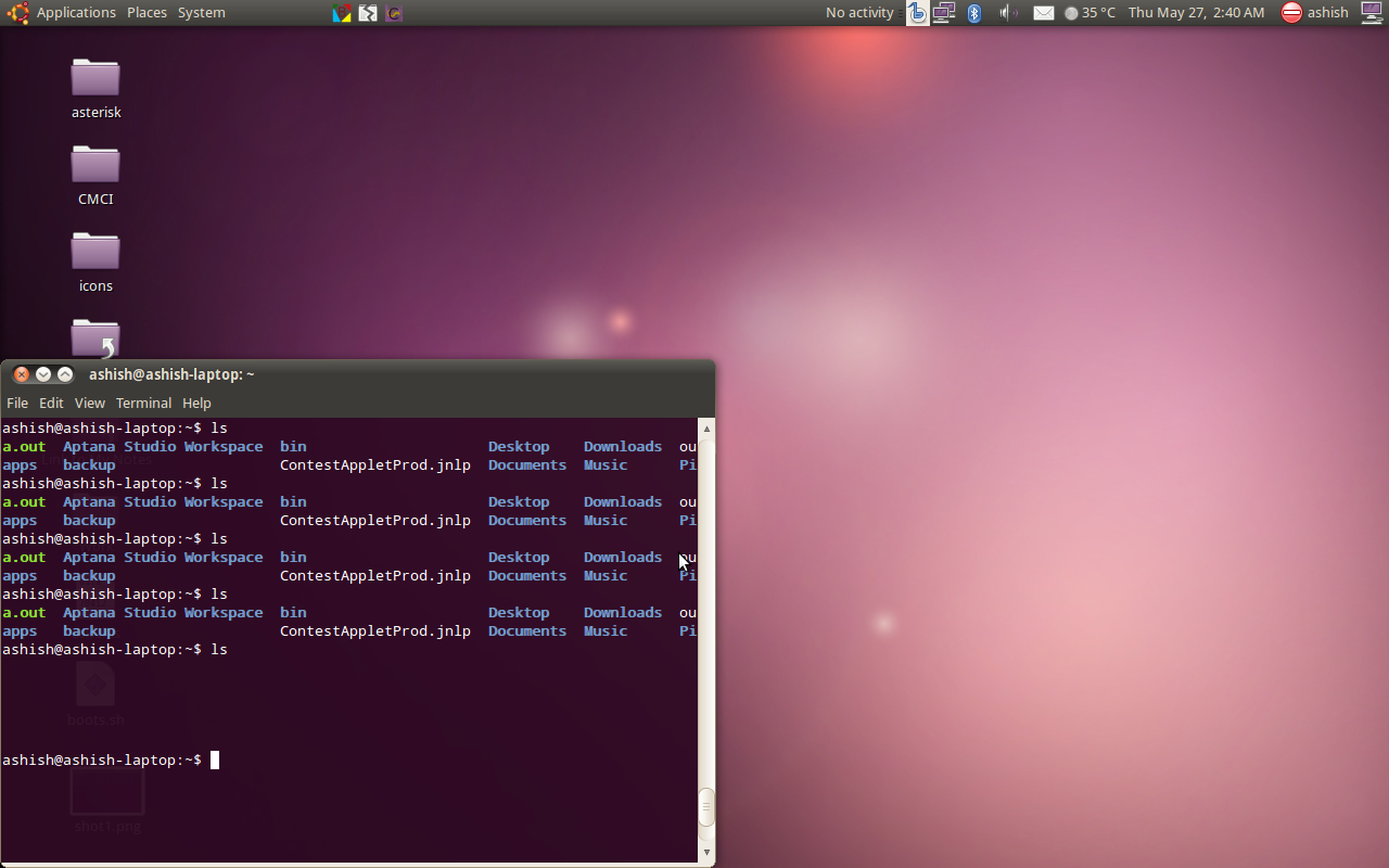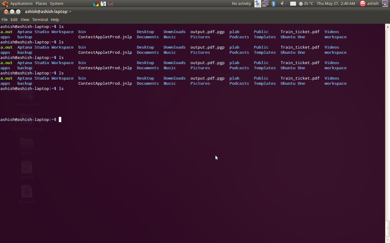 As part of my gsoc project, I've been doing developments on the curses based UI for boots. My work is available in the branch lp:~ashishsharma/boots/cui-main . In this part I am now working out the way in which I should handle the buffer in terminal. In which way should I keep the buffer contents so that scrolling through it is efficient. I was recently looking at the gnome-terminal to see how it handles its buffer. I did the following experiment, I opened a small terminal window, did *ls*sometimes. After that I maximized it. Then I did ls some more times and then un-maximized it. shot1.png is of maximized window and shot2.png is of un-maximized window. I found that the gnome-terminal maintains a *buffer of fixed-size line* . So in curses UI also I'm planning to create a buffer that will store fixed-size lines. On terminal resize the contents of the buffer already create shall not be changed according to new line size of terminal. The display will show contents of buffer lines that can be shown (i.e, suppose you currently have 80 char long lines, ls prints in two lines. Now when a resize occurs and line size becomes 160 char, then this previous ls output will not be formatted again.). Comments and feedback on this understanding of mine how terminal works will be highly appreciated. Best regards, Ashish Sharma (_buck) http://www.google.com/profiles/eraser029