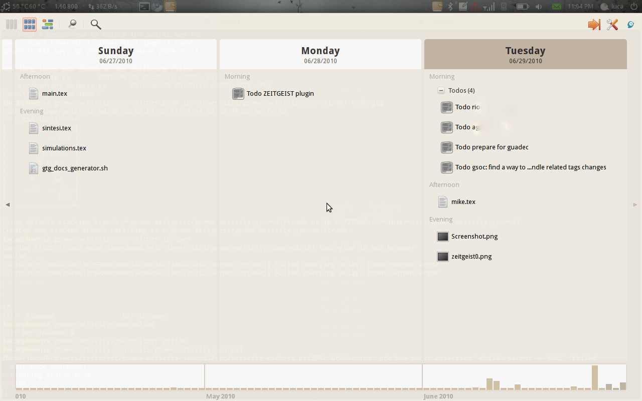 Hello there, I wanted to share a couple of nice pictures with you. GTG is now able to export to zeitgeist (still needs polishing, but it works). Pictures of gnome-activity-journal featuring GTG attached. I've also added uri support for gtg (gtg://<task-id>). You can now open gtg tasks via the standard xdg-open, or by clicking on the widget in gnome-activity-journal. Aloha, Luca