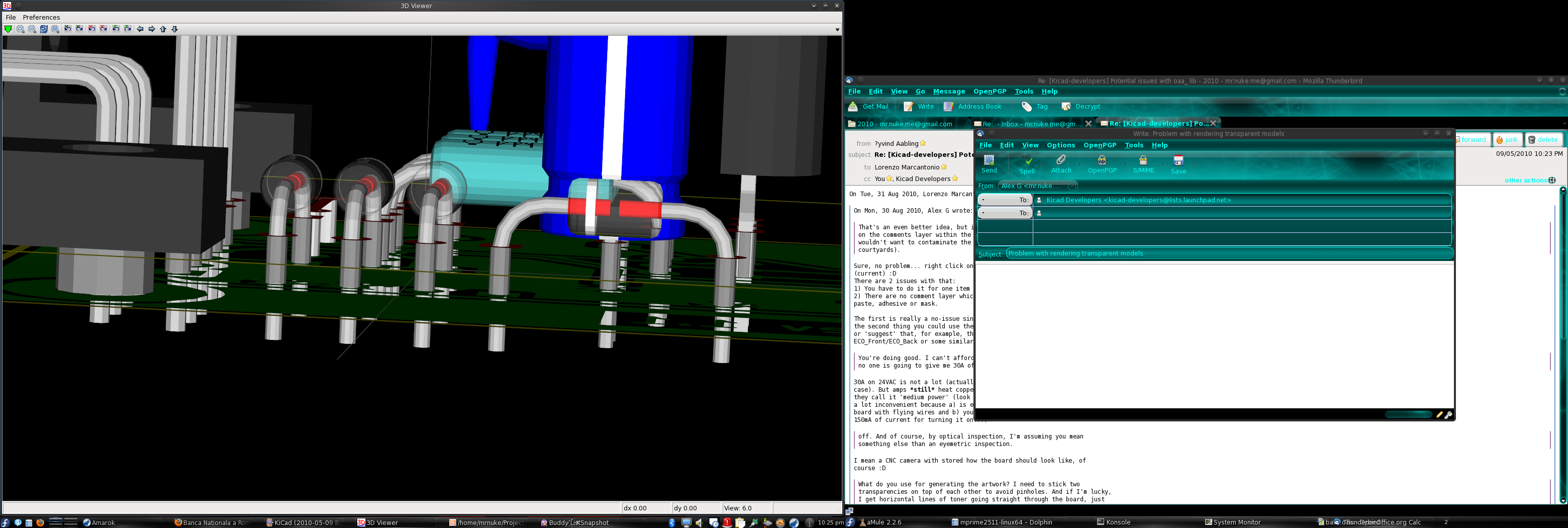 -----BEGIN PGP SIGNED MESSAGE----- Hash: SHA1 There's a problem with rendering transparent 3d packages. Some components situated behind transparent ones are completely covered by the transparent one, and some are not. This might happen if the rendering order is not back to front, and the parts components that get drawn afterward might not get rendered because of the z-buffer. The result is sometimes disturbing :P . (Yes, I tested this with the latest development branch BZR2479). See attachment, as my words confuse even me. Alex -----BEGIN PGP SIGNATURE----- Version: GnuPG v1.4.10 (GNU/Linux) Comment: Using GnuPG with Fedora - http://enigmail.mozdev.org/ iQIcBAEBAgAGBQJMh+WSAAoJEL0kPHNPXJJKmRYP/0UcGqFiabLSpm/W4Y9tg8nz 6AcPRkJeeDhL+W2P1atC5e/GYa/h/tZmpKwCNGsAeQKimq7WsQWInPJQxutt/15n lKweWDwplOTsCSPOnPRBO+k3p5L5OGbMWN0viPZL/0DY0kTHNk/kXsz1OW+O8Wou uvxz4oe1dUYi3qOkHnu2DVUqmmldctRkJeiYDfmggN92VGVjcWYzhI1Ed7pF4h0X GFi13u7X8nNgsEFSGqvCnmKL8z8nQDOWtVlkS83D6vx4oulAm8bi0GGXItfo1yxr UvBYH2PlhhX9j8zU1HhJ2Q/aWeCOVguQVp290UnO9CKWFLUxbBsnb7pBgRixJKdq AtnX5mnILuH8BHU4qo38l2xInezJUKVBxgMJ2tkpD2OHXtm4CyEwRrb5NmTvjJ8J rqqgJNq04fZoZmiyW5Lo4MH1frSRvIerzQ8Po9+f6mjbwMy80wfwPwfW1wZuz2XM jgKNrQR7FfTcbLu1Zaye9zXRkTr6nFO+rhl5N1Vfjh6bcTjKEpsyLgTQVsVO6wO/ oKR6CNwYBh7/bcTG8au7w/bzZ3W3e3T6ZuW/6hljNeQEmG8punCtF654yslQBGv2 ZTt/vyZe8F8EcQZXphW/iGUCUP7XcBkHQtxCVv07K0PmPx/PxSTUZMrtJ47ldmfk p6ukAlP7oWN0dLqMXcDF =KIIU -----END PGP SIGNATURE-----