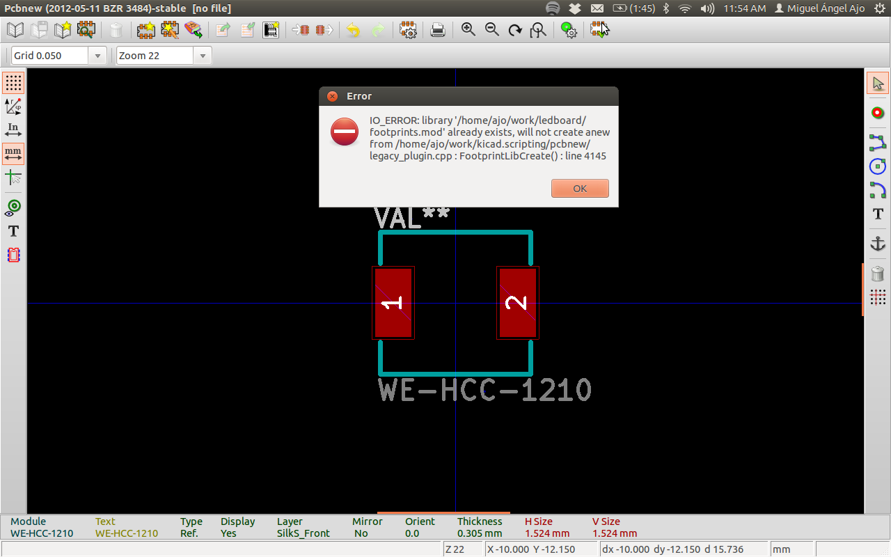 https://bugs.launchpad.net/kicad/+bug/999573 I tried to export a library from footprint editor, and overwriting an already existing one, so the UI asked me "Do you really want to overwrite?", I said yes, but then LEGACY_PLUGIN throw an exception: [image: Imágenes integradas 1] -- Miguel Angel Ajo Pelayo http://www.nbee.es +34 636 52 25 69 skype: ajoajoajo