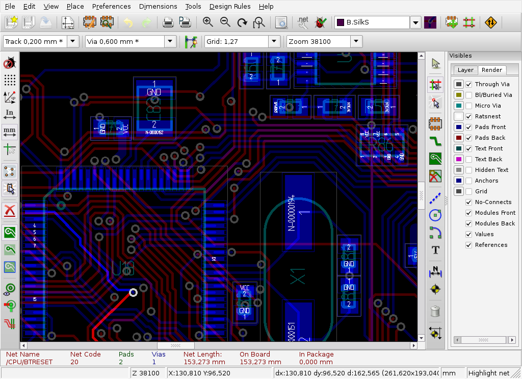 After years of intensive usage I decided that the kicad palette (pcbnew to be exact) was too limited. I 'simply' added another level of brightness for every color while maintaining the dynamic range. Also had to make sure everything was contrasted and stuff when shown ORed (the comments actually cautioned about that!) Anyway, with this you can see how tracks go on pad *and* having a good track highlighting without using sketch mode. The one issue is that color numbers are not backward compatible, i.e. you have to reassign them... The light yellow (an anomaly) remains because: it may be useful for *something* (i.e. backward compatibility), I had to fill the hole in the grid and anyway is somewhat cute... Attached: - The patch (quite obvious) - A screenshot of the new palette - A screenshot of pcbnew in actual use I actually usually work with silk screen and courtyard disabled, but it's pretty usable even with this level of junk. Subdued colours are useful to avoid retinal burn after 8 hours of trackage XD. Of course nothing could help if you wanted to track 4 copper layers or more simultaneously... PS: I use ECO1 for the courtyard. However in these days I committed some of (a lot of) changes enabling to add lots of layers in the near future (I was waiting for the new file format for this). I hope to have soon assembly and courtyards as separate and properly flippable layers. -- Lorenzo Marcantonio Logos Srl