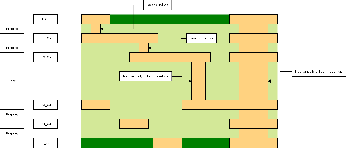 After a discussion with Nick Oestergard on IRC, I've come to the conclusion that we really need to sit back and think about how design rules for vias and stackups are handled. As of right now, we have three kinds of vias: 1) Through-board via. These penetrate the entire board and can connect any layers in between. 2) Microvia. These can only go from an outer layer to the adjacent internal layer. 3) Blind/buried via. These go from any layer to any other layer, and can connect anything in between. We currently have two sets of design rules: 1) Drilled vias. There is a global minimum, netclass default size, and a list of custom sizes. This applies to both through and blind/buried vias. 2) Microvias. There is a global minimum, netclass default size, but no support for custom sizes. Unfortunately, this doesn't accurately reflect the realities of PCB manufacture. Mechanical drills can be done through the entire stack at any point during manufacture (including before all layers have been laminated), and laser drills can be done from any layer to the next one down (including before all layers have been laminated). Furthermore, minimum diameters of drills are typically limited by aspect ratio concerns. In other words, the less depth a drill has to penetrate, the smaller the hole can be. To illustrate my point, I've attached a cross section of a typical 6-layer HDI stackup (similar, but not identical, to one that I used on a project for work recently). There are quite a few different kinds of vias: 1) Buried mechanical drills from layer 3 to 4, through the board core before any prepregs are applied. These can be slightly smaller than through-board mechanical drills since the stack is thinner. 2) Buried laser drills from layer 2 to 3, the first level of prepreg, before the outer layer is laminated. These can be very tiny since they're only penetrating one layer. 3) Blind laser drills from layer 1 to 2, the second level of prepreg, after the stack is fully laminated. These can be just as small as the buried laser drills. 4) Mechanical drills through the entire board after the stack is fully laminated. These are the largest since they have to penetrate the entire stack. 5) Laser drills on the back side (4-5 or 5-6) are not allowed at all since this requires an extra process step, increases cost, and I only had fine-pitch BGAs on the front side of the board. Kicad's current model cannot handle this case well. I could use "microvias" from 1-2, but the 2-3 vias need to be "blind/buried", which uses the global through-board drill design rule. This means that I need to set the global drill minimum to something tiny like 6 mils, which would implicitly allow a 6 mil through-board mechanical drill (something few fabs can manufacture at all, and certainly not for a reasonable price). I also would need to enable blind/buried vias globally, which would allow me to do a 4-5 or 5-6 laser via accidentally and not catch it until I exported CAM files for manufacture. I think what we really need to do is define a more complete stackup editor that specifies layer thicknesses (for future impedance control/current capacity calculations etc), dielectric constants, and allows a list of layer pairs and via sizes to be defined. Does anyone have input into how this should work? I'm pretty busy but would like to at least get a non-functional mockup of the UI prototyped soon. For extra fun in the longer term, integrate with the PCB calculator so you can design design rules for target impedances. For example: Layer | Width | Spacing | Type | Z0 target | Z0 actual | F_Cu | 0.15 | | Single | 50.00 | 48.95 | F_Cu | 0.25 | 0.125 | Diff | 100.00 | 101.32 | In1_Cu | 0.125 | | Single | 50.00 | 51.24 | Then just select "50 ohm single" from the track width dropdown and the correct size for the current layer will be used automatically. -- Andrew Zonenberg PhD student, security group Computer Science Department Rensselaer Polytechnic Institute http://colossus.cs.rpi.edu/~azonenberg/