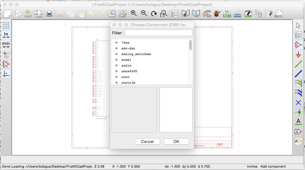 library popup (KiCadScreenDump.jpg). The files in the popup have been