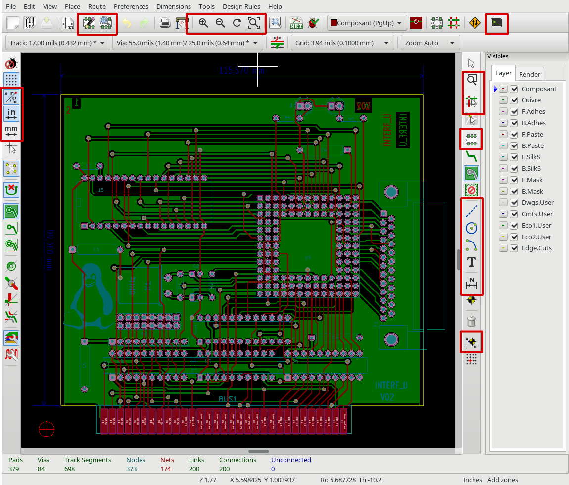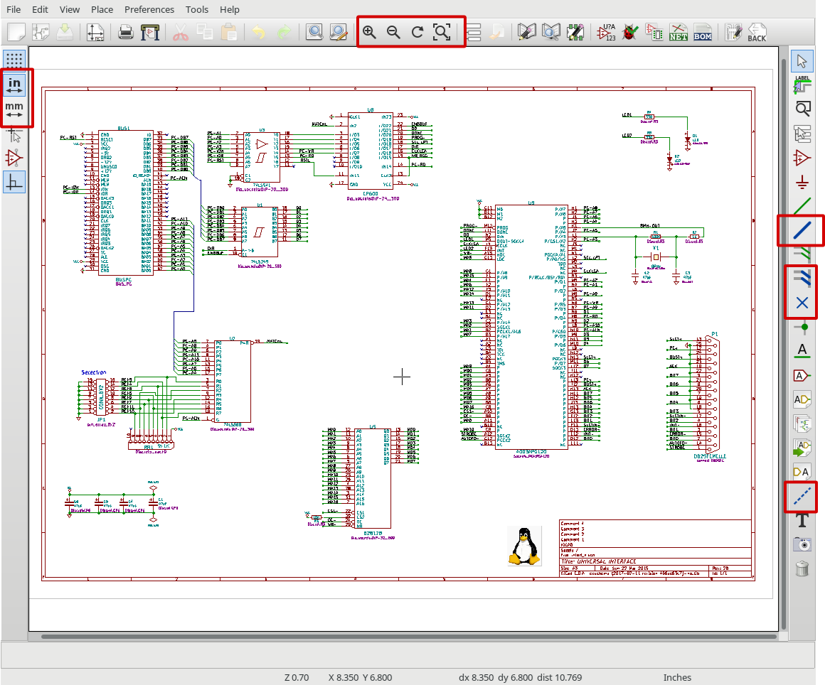 And here are the same images with the changed icons highlighted, maybe not everyone loves spot-the-difference puzzles that much! Some icons are hidden in menus which I don't seem to be able to screenshot. Cheers, John On Sat, Feb 11, 2017 at 5:37 AM, John Beard <john.j.beard@xxxxxxxxx> wrote: > Hi, > > I have a few tweaks to some icons in Pcbnew and Eeschema. These are > mostly minor tweaks that are intended to make the icons match a little > better and give a more uniform look and feel: > > https://code.launchpad.net/~john-j-beard/kicad/+git/kicad/+ref/icons > > * Pixel align a few icons to make then crisper when displayed > * Redraw all the zoom icons to be crisper and flatter. The zoom to fit > (Home) icon is now a sort of reticle rather than a pair of square > brackets as text. > * Redraw console icon to be flat to match other existing icons. > * Mute some very bright colours, especially the green-legged module > icons - use the zone icons as a guide for the colour brightness. > > Attached are screen shots of pcbnew and eeschema, where you can see > some of the icons. > > I know icons and UI subjects in general are very subjective and > personal, so I'd welcome input! > > Cheers, > > John