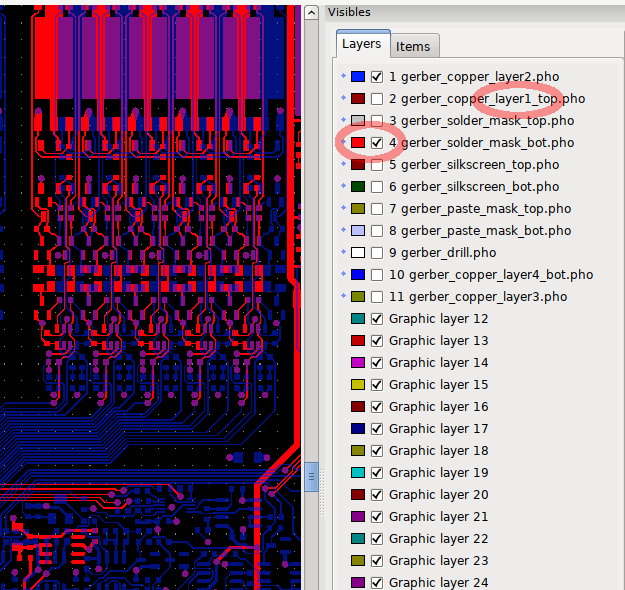 But in the tab view, the filenames get mixed up. The 4th line toggles Layer 4 (bottom, blue) but gerber_solder_mask_bot.pho would look completely different.
