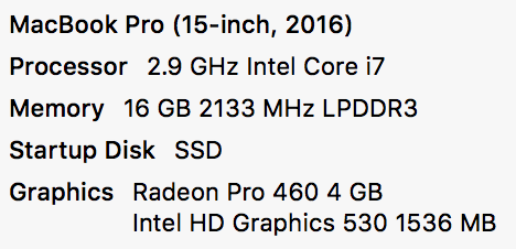 >>> On a 2017 MacBook Pro (Retina, touch bar, 16 GB RAM, with the Radeon 555