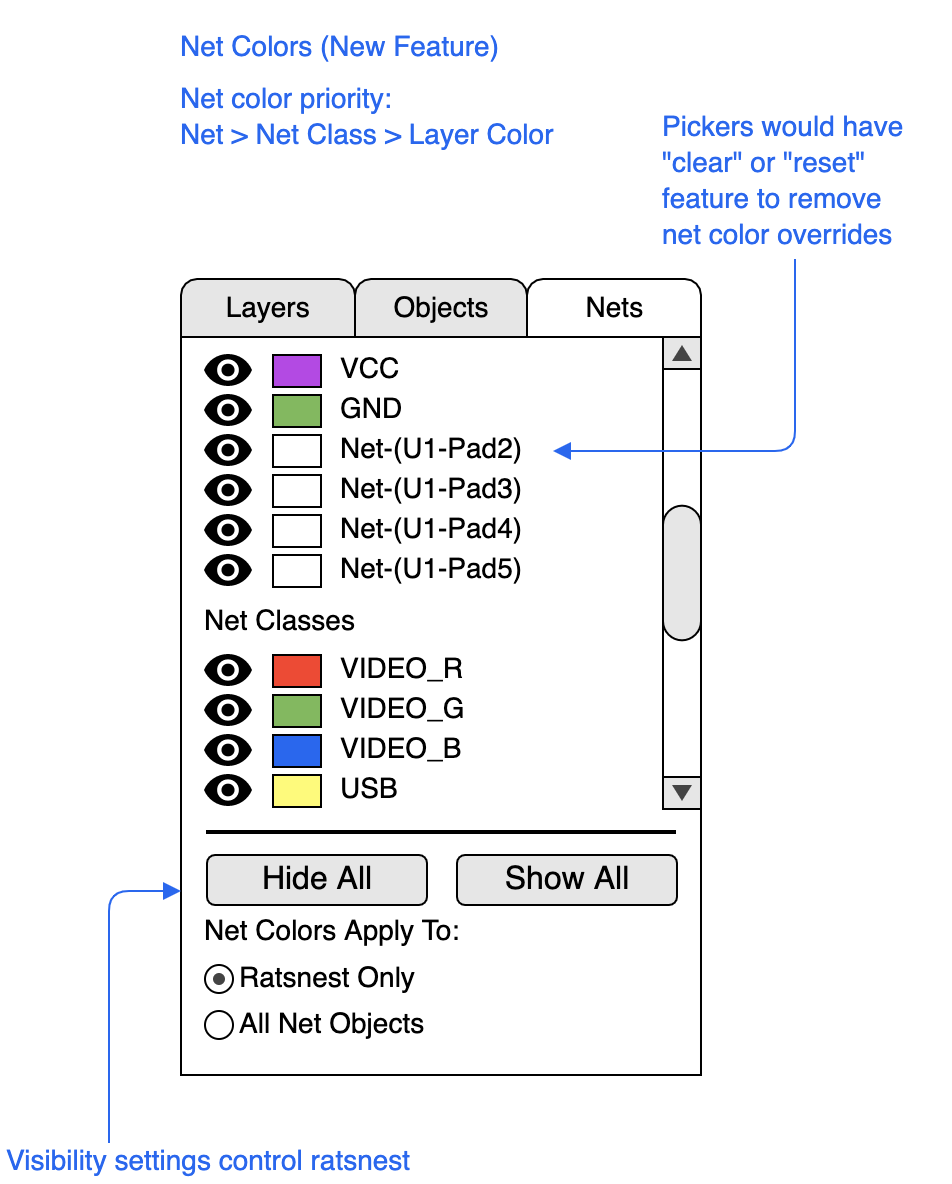 >>> supports showing/hiding nets by name via the command line, and KiCad needs