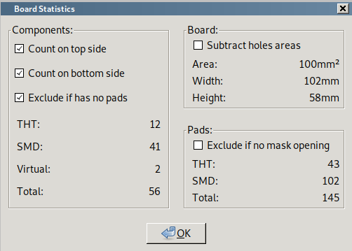 Hi!, I added stuff for footprints THT,SMD,virtual properties and now it's calculate area. But for me dialog is not very straight forward now. Can you please advice, what better to do? I attached 2 pics. I think, maybe right way is to add few checkboxes which will change dialog data as soon as you pressed them? Just look at pics and say what would be better, as I'm in doubt. Second one is in WxFormBuilder so it looks a bit different. >Пятница, 5 июля 2019, 0:05 +03:00 от Jeff Young <jeff@xxxxxxxxx>: > >I agree that it shouldn’t be its own tool, but PCB_EDITOR_CONTROL is getting too big. > >Let’s just name this tool the PCB_INSPECTION_TOOL, and then I’ll move the highlight and list nets stuff, and the DRC dialog to it later. That’ll nicely parallel the EE_INSPECTION_TOOL. > >Cheers, >Jeff. > >>On 4 Jul 2019, at 21:56, Ian McInerney < Ian.S.McInerney@xxxxxxxx > wrote: >>This looks nice, but a few comments from my initial usage of it: >> >>Usability: >>1) When I use english units, your statistics dialog gives the dimensions in mils. It should probably give those in inches instead, since that is what the grid panel at the bottom gives. >>2) Including the board area would also be useful, definitely the area of the bounding box, and possibly the area of the actual PCB (but that is more complicated). I know of several board houses that charge based on area, so this could provide a quick way to estimate price for the user. >>3) I am not sure I am a fan of the icon used for the menu item, since this dialog focuses on board statistics rather than footprint statistics and that icon is used mainly for footprint actions. Could a variant of the pcbnew icon be used? >> >> >>While the code as you gave works, I think the following changes could be beneficial: >>1) It seems that this action could just be added to PCB_EDITOR_CONTROL as the action "pcbnew.Control.BoardStatistics" rather than creating a new tool just for this. >>2) I think the launching of the window could be simplified if you used a modal window instead (see https://docs.wxwidgets.org/3.0/classwx_dialog.html , the Modal and Modeless section). Then you don't have to keep track of the window pointer, and could actually just make launching this a single function instead of an entire class (this would go nicely with point #1). >>3) The function to start the window should be TransferDataToWindow, not TransferDataFromWindow. FromWindow is called when the window is destroyed and ToWindow is called when it is created. Also, it is called automatically when the window is started, so there is no need to manually call it. >> >> >>Other code parts: >>1) There are some lines that are too long in dialog_board_statistics.cpp (max 100 characters per line) >>2) There are a few whitespace errors when applying it: >>Applying: added board statistics dialog, which shows info for production and assembly >>/home/imcinerney/Downloads/0001-added-board-statistics-dialog-which-shows-info-for-p.patch:158: trailing whitespace. >> /* if pin has drill with width==0 and height==0, we >>/home/imcinerney/Downloads/0001-added-board-statistics-dialog-which-shows-info-for-p.patch:1612: new blank line at EOF. >>+ >>warning: 2 lines add whitespace errors. >> >>Overall though it looks pretty nice. >> >>-Ian >>On Thu, Jul 4, 2019 at 3:07 PM Шуклин Александр < jasuramme@xxxxxxx > wrote: >>>Hi, that's first time I try to contribute to KiCad and write to Launchpad mailing lists, so please, don't beat me to hard ))) >>>I really miss some board statistic dialog, where you can see quantity of SMD pads, THT pads, board dimensions, all the stuff, you need for PCB production and assembly. There was also issue in the bug tracker >>>https://bugs.launchpad.net/kicad/+bug/1817232 >>>And like guy from bug issue, I moved from Altium Designer and miss that dialog as well. >>>Can you please look at that and commit if you think it's useful or tell me what to change. >>>That's my commit in the github: >>>https://github.com/jasuramme/kicad-source-mirror/commit/6290375c1d41ddb89d4b08067593f170c7d344c5 >>>and branch: >>>https://github.com/jasuramme/kicad-source-mirror/tree/statistic_dialog >>>and there's also patch and dialogs pics in the attachment. >>> >>>_______________________________________________ >>>Mailing list: https://launchpad.net/~kicad-developers >>>Post to : kicad-developers@xxxxxxxxxxxxxxxxxxx >>>Unsubscribe : https://launchpad.net/~kicad-developers >>>More help : https://help.launchpad.net/ListHelp >>_______________________________________________ >>Mailing list: https://launchpad.net/~kicad-developers >>Post to : kicad-developers@xxxxxxxxxxxxxxxxxxx >>Unsubscribe : https://launchpad.net/~kicad-developers >>More help : https://help.launchpad.net/ListHelp > -- Alexander Shuklin