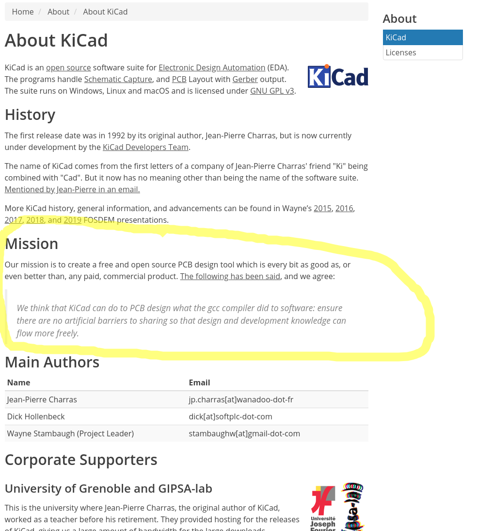 Hi all, I've opened this PR to update the website readme and to add a mission statement: https://gitlab.com/kicad/services/kicad-website/-/merge_requests/513/diffs#311665d8a02bb3b68241917e34c72a33cf7f2545_39_39 Here's what it would look like: [image: image.png] Thoughts? Gabriel Staples