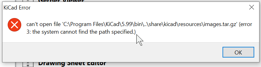 This error: can't open file 'share/kicad/resources/images.tar.gz' indicates