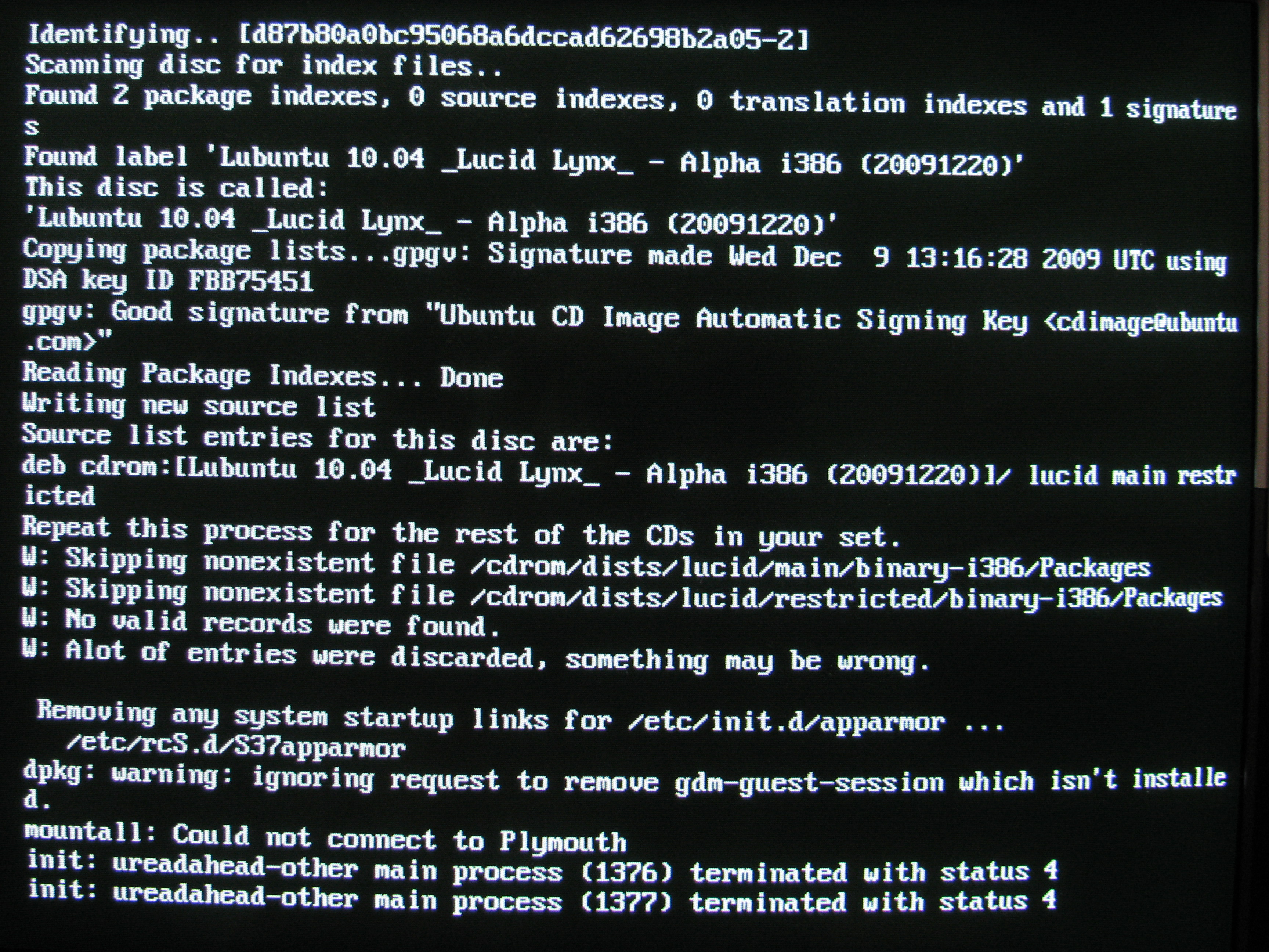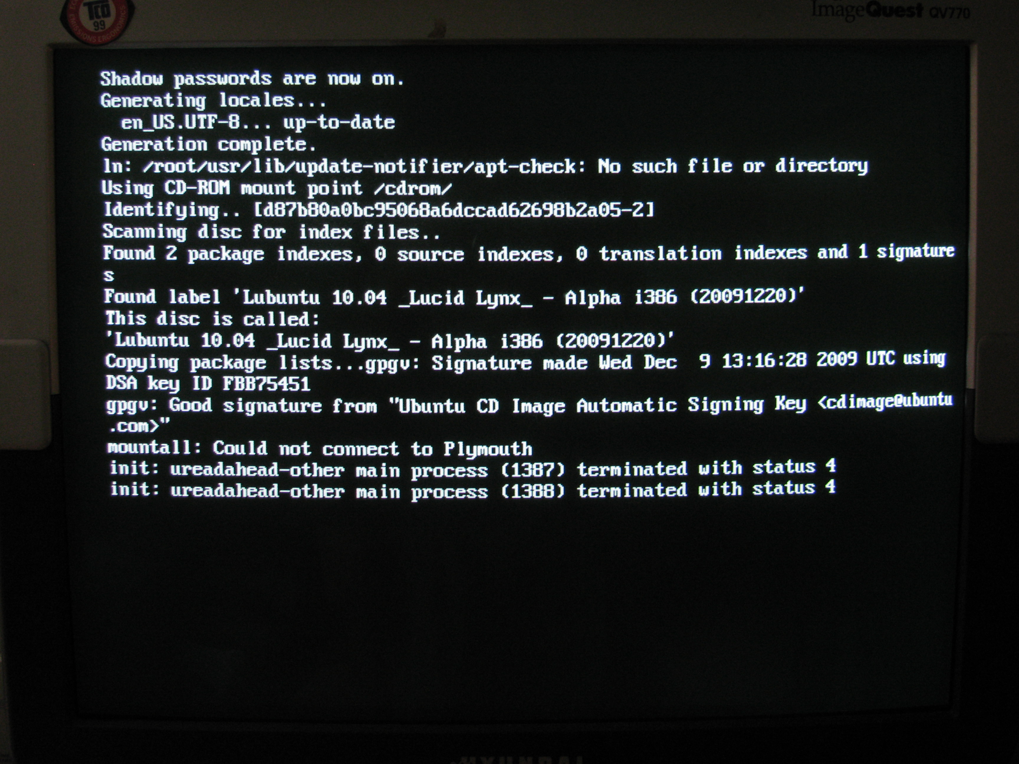 - Couldn't boot from CD on my notebook. Booting process ends with just a flickering desktop. - Couldn't boot from either CD or USB-stick from my older computer. (Output attached)- Lubuntu runs very nicely on my Asus eee 4GB. Boots without problems from USB-stick (same I tried for computer above). System is responsive and I detected no problems so far. I only wondered if it is possible to install and use the window-picker-applet and maximus with lxde. Couldn't test it as I didn't wanted to install Lubuntu. With the live-USB it didn't work but I'd really appreciate if it would. On such little screens as found on netbooks the mentioned two programs are indispensable. At least for me. A little bit annoying though merely cosmetic: when you have a top pane autohiding - the hole desktop-background moves with it when it unhides. (same in Virtualbox - so it is a lxde feature I guess) - Virtualbox: Most of the problems here seem to originate from Lucid Lynx Alpha it seems to me. Installation went without problems but Lubuntu runs not! very smooth and responsive.
