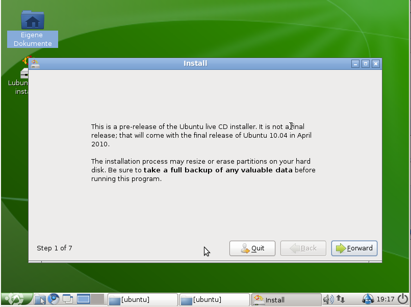 look, thats what i meant: the icons arejust not in the middle. maybe its also an optical illusion because of the little line under the quicklaunchers that doesn't continue under the tabs. and something i forgot: for root-pw i just pressed space and ignored the warnings. But the login window didn't take space as a password, it just returned to the user-choice. On the console i could login and change the pw. Has sdl to many dependencies? if not, we could include that and write some easy games there. regards, jo 2010/2/24 Julien Lavergne <gilir@xxxxxxxxxx> > Thanks for testing. > > Le mercredi 24 février 2010 à 16:30 +0100, Jo Gerb a écrit : > > 2.)The installation with sudo ubiquity goes quite fast. after half an > > hour, i could reboot and see the login window. One little graphical > > thing: what about making the logo there white, like it was > > illuminated? i tried it and that looks quite good, no matter if you > > use a blue or a green background. > Well, we try to be consistent in the artwork. The problem, everyone have > a different opinion on the artwork :) > > > 3.) Sometimes on startup with the livecd i got this error-message: > > "Error: unable to establish connection with FAM. Do you have "Fam" and > > "Gamin" installed and running?" is there already a bug report, or what > > is it? Or is it something with pcmanfm, that will become batter with > > version2 ? > Let's try with the next Alpha, with pcmanfm2, to see if it's still the > case. > > > 4.) Same with some icons. They seem to "fall of the screen", they are > > not in the middle of the "tab" (how do you call them?) > Do you have a screenshot ? > > > > 5.) Software we should add: gdebi-gtk and some games. > Should be added in the next Alpha. > > Regards, > Julien Lavergne > >