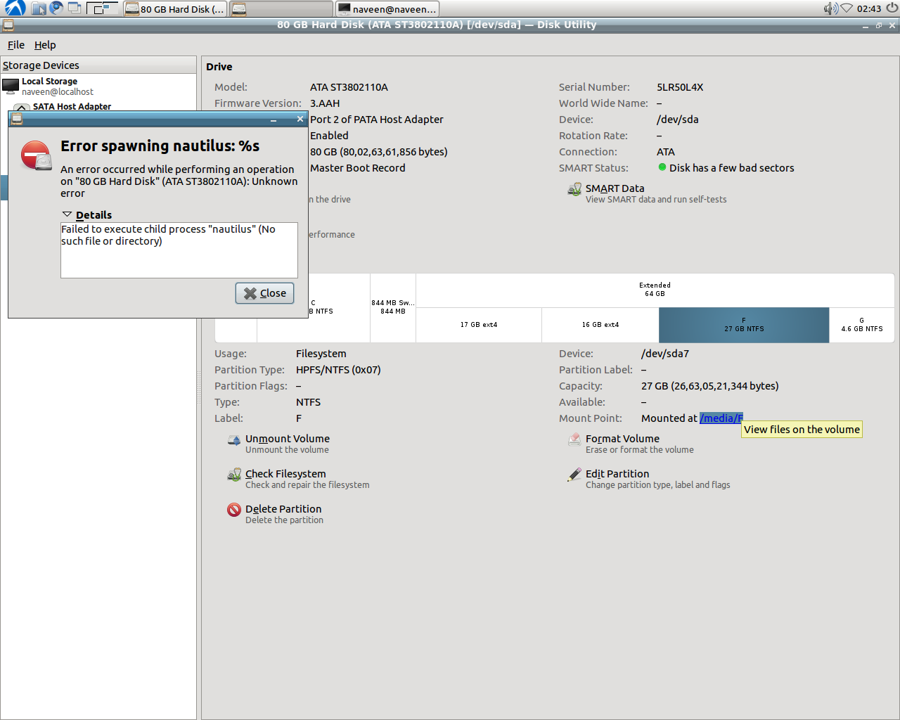 Hi While trying to open the mount-point in Disk-Utility(palimpsest), I came across a bug that Disk-Utility asks for nautilus file manger instead of pcman. I am attaching the screenshot[1] of the problem. Regards Naveen