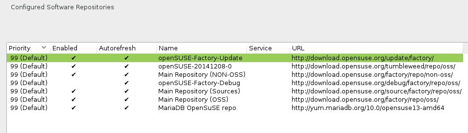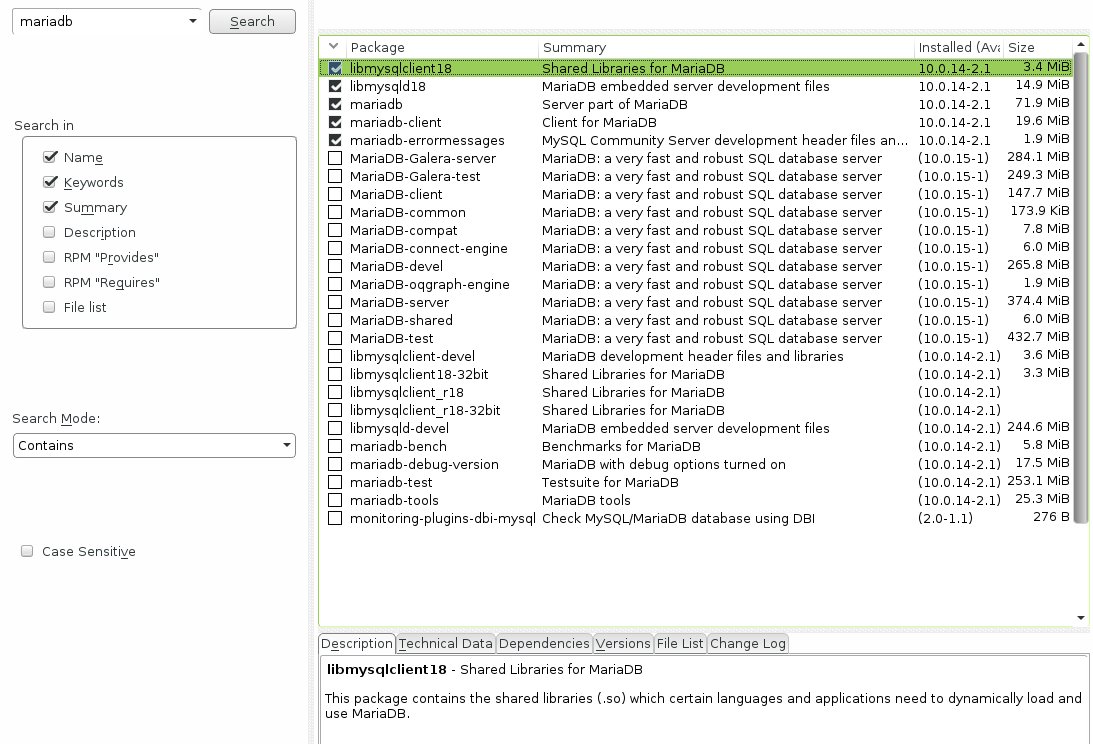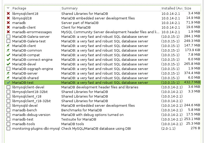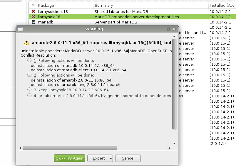 I have written about this in another thread. But let us take it from scratch. The other thread is messy. The problem is KDE and certain KDE programs. Quite a lot of those have an option to store data in MySQL (embedded or not) and they install dependent libraries in order to do so. Do this to reproduce and understand the problem: 1) Install OpenSUSE with a GUI. I used xfce desktop, but it should be the same with any destop not based on KDE (with KDE and KDE-derivates, it could be more complicated) 2) During install also install the "LAMP Server". Probably just installing MariaDB 10.10.14 from SuSE's repos later will also do. 3) Now install Amarok (for instance). Inspect dependencies being installed - including two MySQL-related libraries. I used the GUI for install but probably zypper has a --verbose option listing dependencies. See dependencies.jpg. 4) Register MariaDB's repo for SuSE '. See repos.jpg 5) Open "Software management" and search for MariaDB . See packages.jpg 6) MariaDB's RPMs do not resolve dependencies on libraries installed with Amarok (see conflict.jpg). 7) But you can do manually - if using the GUI at least (as in conflicts_resolved.jpg). Now everything installs and works fine after install. If you don't do it right first time (later is too late!) you will encounter issues. For instance I was only able to use command line clients as root. This is reproducible exactly the same way with OpenSuSE 12.3 GA as well as the 'bleeding edge' "OpenSuSE factory". Should not those dependencies be resolved automatically? -- Peter -- Webyog