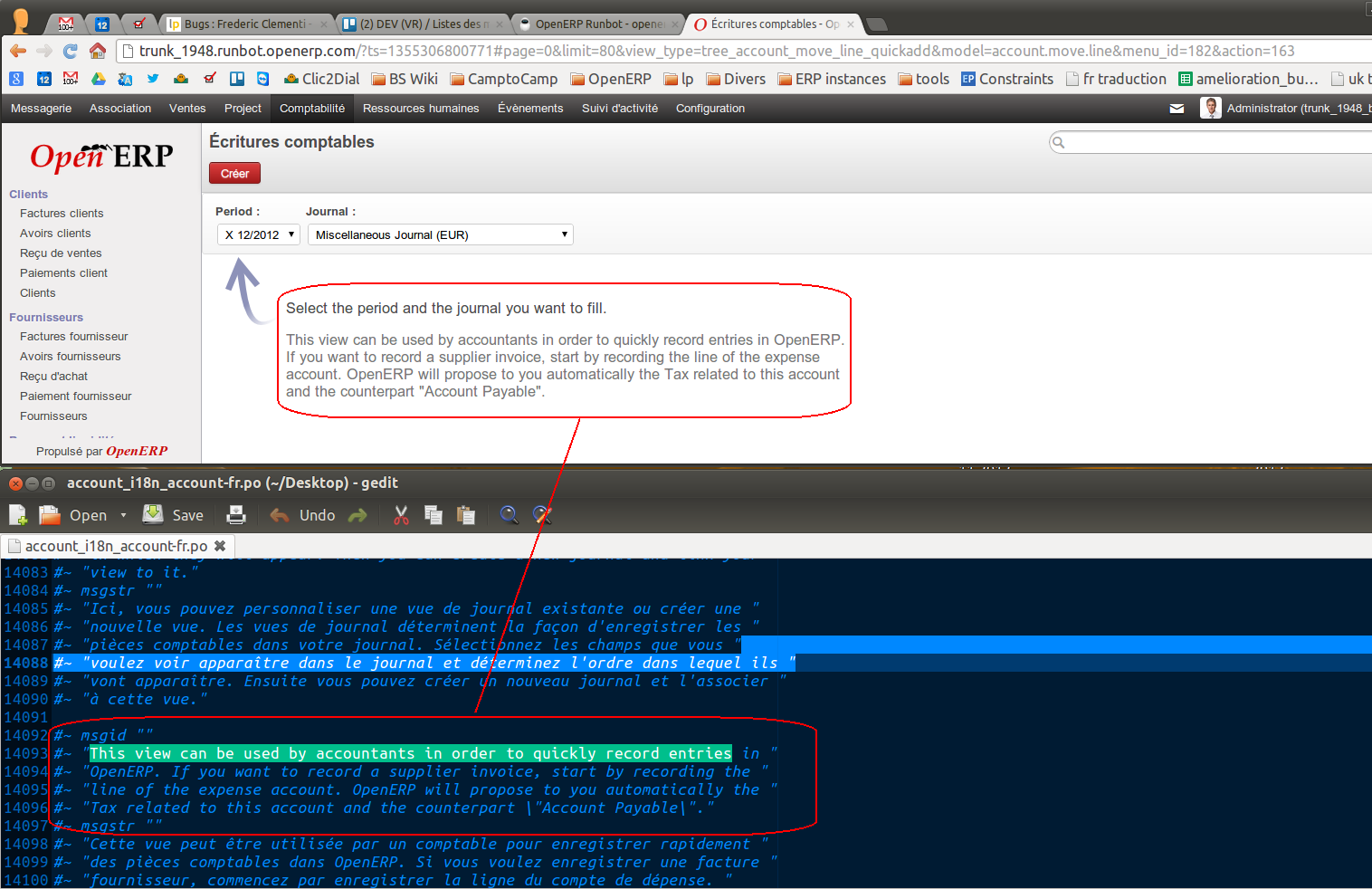 Salut, J'ai téléchargé le fichier po de account en francais dans launchpad et à la fin de ce fichier, de nombreuses traductions sont commentées et la traduction semble impossible. En faisant des recherche de terme directement sur launchpad, j'ai systèmatiquement une erreur de timeout ... Alors comment faire pour traduire par exemple la vue sur mon prinstscreen attaché : 'pb_traductions.png' En vous remerciant par avance, Frédéric CLEMENTI Business Solutions Camptocamp SA Tel : + 41 (0)21 619 1041 http://www.camptocamp.com <frederic.clementi@xxxxxxxxxxxxxx>