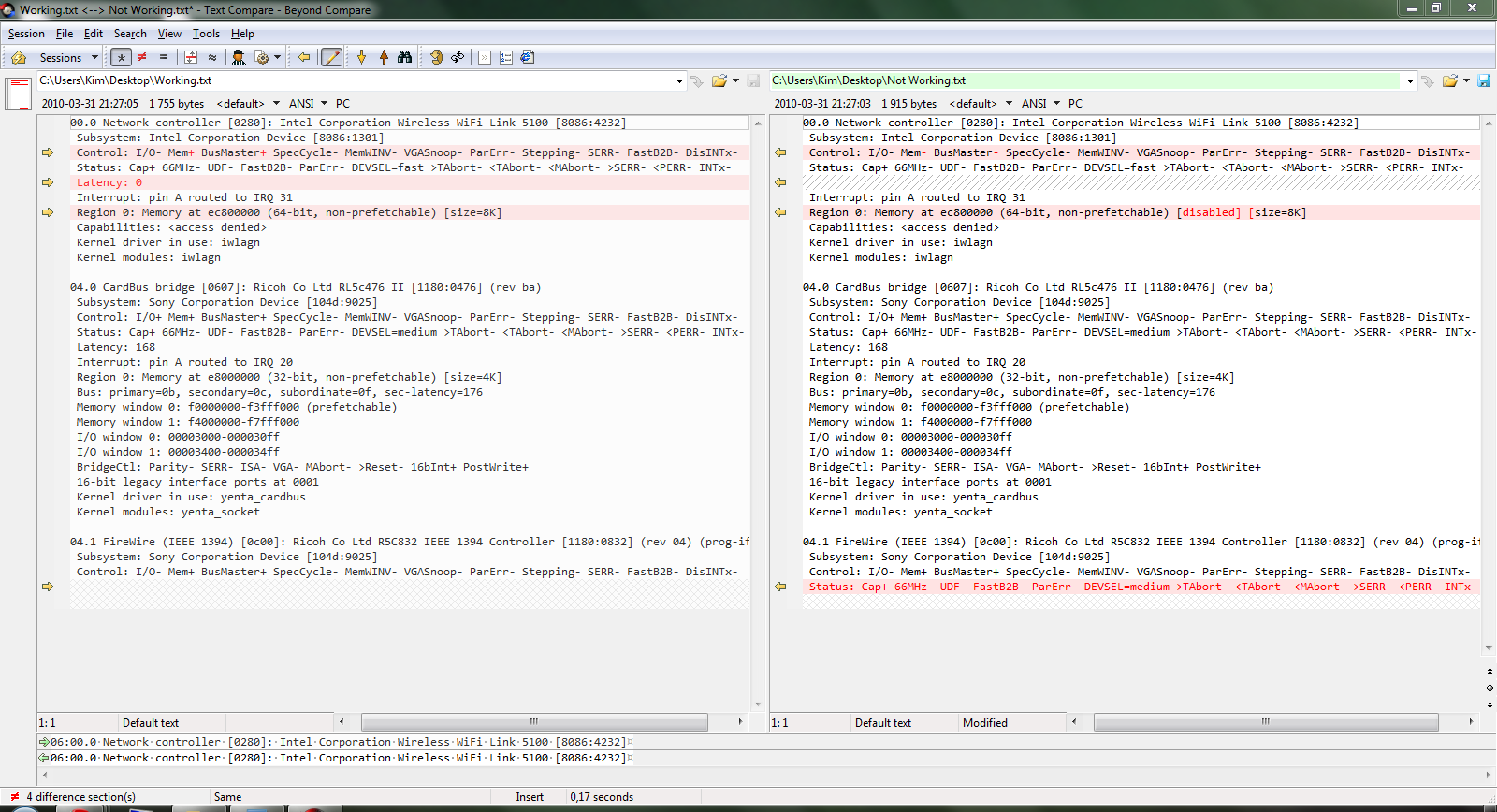 I've attached the two outputs as Working.txt and Not Working.txt. I've also