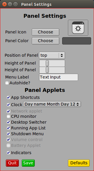 On 06/15/2014 10:30 AM, Nio Wiklund wrote: > 2014-06-15 15:40, Israel skrev: >> ... > Hi Israel, > > I think it looks good except the colours. I would prefer slightly softer > colours for the buttons, not fully bright red, green and yellow. > > The 'reset to defaults' is a good function. > > Best regards > Nio Hi Nio, I really appreciate your feedback!! This is very helpful! I am prototyping the 'Settings Manager' to get ideas on how it should look. So here is the screenshot for that. I changed the colors and the look of the panel config also.. Let me know if this color scheme is better, or worse :)