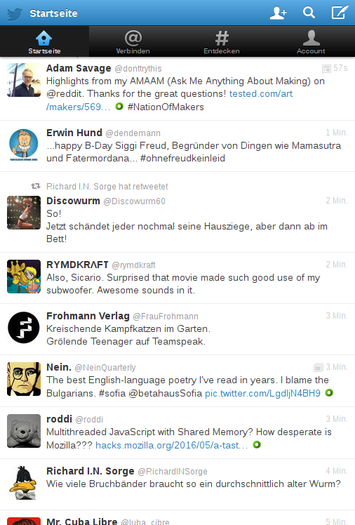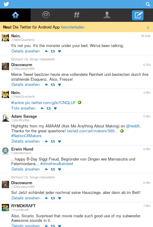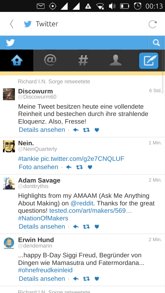 Hello, since some weeks the UT Twitter app got a "graphics downgrade": small icons, awful "hitboxes"*, no picture upload, no "pull down to refresh", no endless scrolling, no swipe. Both browser and app (It's the same, I think the app is a web app "only" ^^) I've researched a bit and found out Twitter seems to "block" our browser because of it's User Agent** (see attached images; #1 is UT, #2 is mobile.twitter.com via desktop, #3 is desktop with UT UA) My question is whether this is known and where I could file a bug (Avengers didn't help and a quick search brought up nothing.) Thank you. Christoph * Clicking the link/icon you want is nearly impossible, you almost every time open an other link, i.e. user's profile instead of a link in the tweet, the link in the tweet instead of retweet/fav and retweet/fav instead of fav/retweet. ** Mozilla/5.0 (Linux; Ubuntu 14.04 like Android 4.4) AppleWebKit/537.36 Chromium/35.0.1870.2 Mobile Safari/537.36 -- Visit me: https://twitter.com/cherryistoph or https://twitter.com/criztovyl https://criztovyl.joinout.de https://github.com/criztovyl