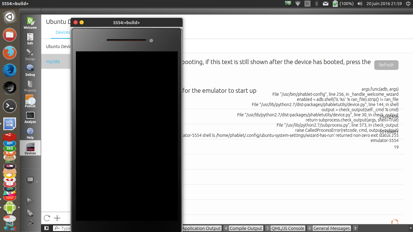 I'm also still stuck with the emulator, having created a new one using the command line : > sudo ubuntu-emulator create --channel=ubuntu-touch/stable myinstance then running > ubuntu-emulator run --scale=0.8 myinstance and I fall in the same situation. I'll create a bug in launchpad. The complete log is in attachment (emulator.log) I've also tried from unbuntu-sdk and the result is even worth, my load avg kept increasing (I think I've stopped the processes at 12). And there was some segfault errors in my syslog (see attachment also) and the nice screenshot of the screwed GUI of the ubuntu-sdk. 2016-06-21 5:20 GMT+02:00 Unix One <unix1@xxxxxxxx>: > On 06/20/2016 09:25 AM, Benjamin Zeller wrote: > > At least the SDK IDE would always suggest you to create a i386/stable > > emulator as default. > > As seen in this blog post > > https://developer.ubuntu.com/en/blog/2016/06/14/calling-testers-new-ubuntu-sdk-ide-post/ > it doesn't suggest one way or the other, it just lets you pick. The post > also mentions that > > "for creating click packages for the phone we will need an armhf target" > > which I read as I won't be able to do this with the i386 target. Is this > wrong? > > > Probably, but they are extremely slow. Its possible that you just did not > > wait long enough. > > OK, this time I started the emulator and waited for over an hour for it > to boot. In the first couple of minutes (roughly) it quickly reached the > spot where it gives the "basename: missing operand" error and then for > the next hour, while taking up 100% of a CPU core, stayed there; at > which point I stopped it. > > My laptop is Dell XPS 13 9350 which has Skylake i7 and 16GB RAM, most of > which was free during this time. I would think if the emulator were > making progress it would have finished the boot, or at least gotten past > that point in that 1 hour time period. > > > Also they can get stuck randomly. > > Well, seems like stuck in an infinite loop during boot, at least. > > Unless anyone has suggestions, I think I'm giving up for now, and I'm > going to use the phone; and alternatively see how useful the i386 > emulator is. > > I would, however, suggest updating the wiki - > https://wiki.ubuntu.com/Touch/Emulator - and maybe few other places, > suggesting that arm emulators may not be reliable for now and to use > i386 or the physical devices, in the hopes of avoiding frustration of > newcomers who might not know. > > Finally, I am new to all this. So please forgive my ignorance. My intent > is to ask questions, learn, and hopefully give feedback. And I am > grateful for any help I get. Thank you! > > -- > Mailing list: https://launchpad.net/~ubuntu-phone > Post to : ubuntu-phone@xxxxxxxxxxxxxxxxxxx > Unsubscribe : https://launchpad.net/~ubuntu-phone > More help : https://help.launchpad.net/ListHelp > -- http://krampstudio.com http://github.com/krampstudio https://twitter.com/kramp