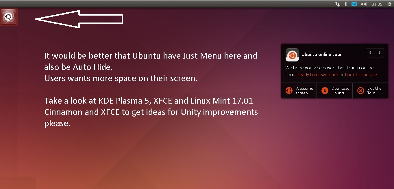 Dear Sir / Madam Take a look at KDE Plasma 5 , XFCE and also Linux Mint 17.01 Cinnamon and XFCE to get ideas for Unity improvements please. I`m waiting for your response. Thanks Nima Panahi Aram
