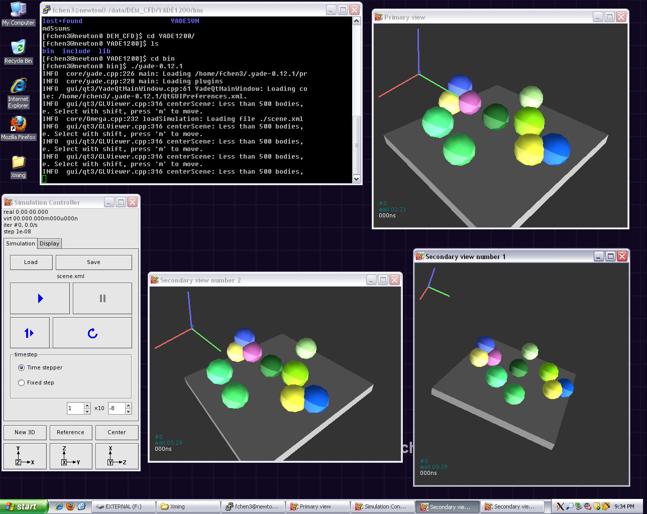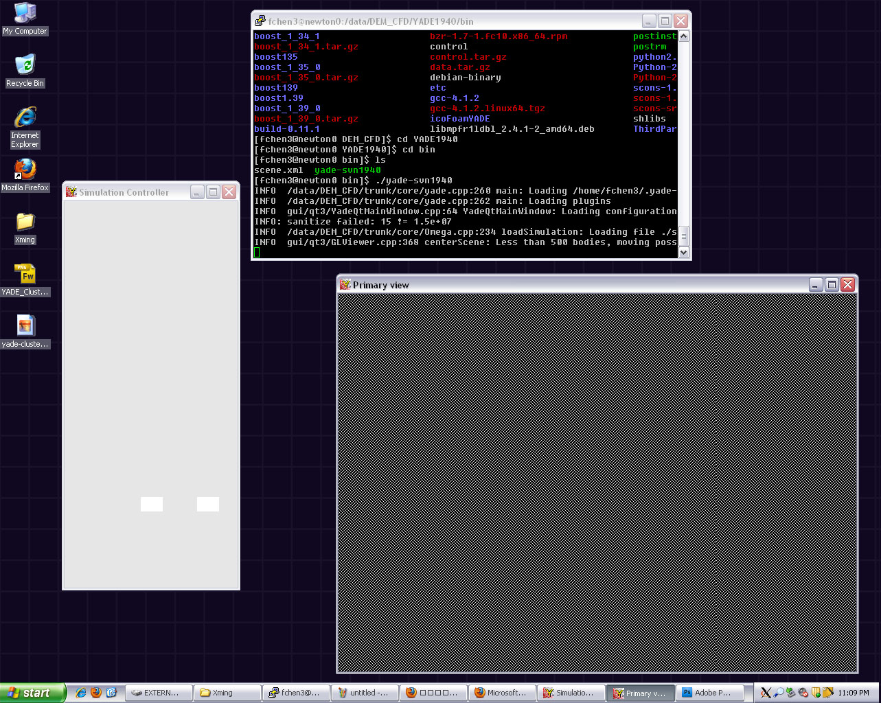 Hi, all: It might be improper to ask a question about the old svn, I have succeeded compiling the YADE on a cluster, and I have also succeeded using X11 forwarding on WinXP using Putty and Xming, however, the YADE subversion .1940 does not work well (the QGLViewer window pops a blank), while it works well for the old 0.12.0, I attached two screenshots (I am sure this is not the X11-server problem because I have tried other X11 servers like X-win32 and Exceed, Xming, the same result), I wonder if it is possible to check out some older versions (like .15xx or .16xx) in svn to see what change made the QGLviewer window unusable? Thanks! I really do not want to frustrate anyone, but it is so cumbersome to install the bzr locally on the cluster (redhat 2.6.18-92.1.18.el5) while I do not have the admin privilege:-), Thanks a lot! Feng Chen Geotechnical Engineer HNTB Federal 9100 Bluebonnet Centre Blvd Suite 301 Baton Rouge, LA 70809 http://fchen3.googlepages.com/home