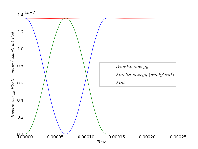 Hi all, I am playing a little bit with the code to understand how thinks work in terms of energy. I started with a very simple example of two balls in normal contact. I am only applying an initial velocity to one particle, hence the total energy of the system is only given by (kinetic + potential elastic). Look at the two attached figures. The first one (dt_crit) is the result obtained using the critical time step computed by Pwave in Yade. The second one (dt_Econst) is obtained decreasing the time step to get the total energy constant. Now I see that the time step influences the solution in terms of energy and this is just a very little example (so it does not really quantify anything). However, I have one consideration: does this mean that we are mainly dealing with non conservative systems in our dem simulations? Is this the right way to compute the total energy? I guess what happens in a system with many bodies (I am gonna try).. Thanks for your opinion, Chiara