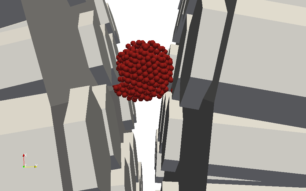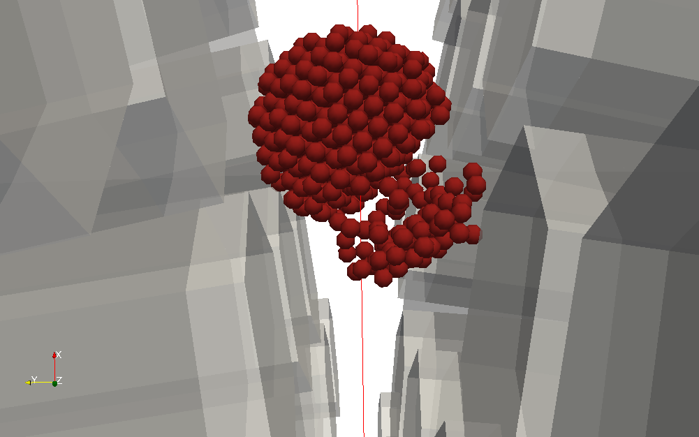 Hi, all! As I wrote before, I met recently the "hanging particle problem". Will try to shortly explain, what I mean. I throw the stone into the "machine" (init.png). Stone is the set of cohesive particles: 1) When I use contact damping, *cundallDamping = 0", all is working as I await, the stone destructs after machine rollers crack it. (contact.png) 2) When I use Cundall's non viscous damping = 0.3, for example, and contactDamping=0, I have a very strange result. The specimen (stone) falls down (gravity), crashes partially and then stops at machine. It begins to "hover" above the machine, hanging. After impact I get this strange behavior. It seems, like the gravity does not work after impact. Machine is continuing to work, but the stone hangs. (cundall.png) Contact damping satisfies me completely. The problem is that there is no energy dissipation after impact, that is why I have "flying far away" particles. I wanted to add "drag engine" or "aerodynamic engine" to decrease particle speed after impact. But after analyzing literature I learned, that on relatively small velocities it will work exactly like our Cundall damping mechanism works. I would appreciate any comments and advices on this problem. I will try "localize" the problem (decrease number of particles, simplify the model etc...), but not sure it is easy. What about if we use CundallDamping only on velocities, larger, than defined value (just an idea)? Thank you. ______________________________ Anton Gladkyy
